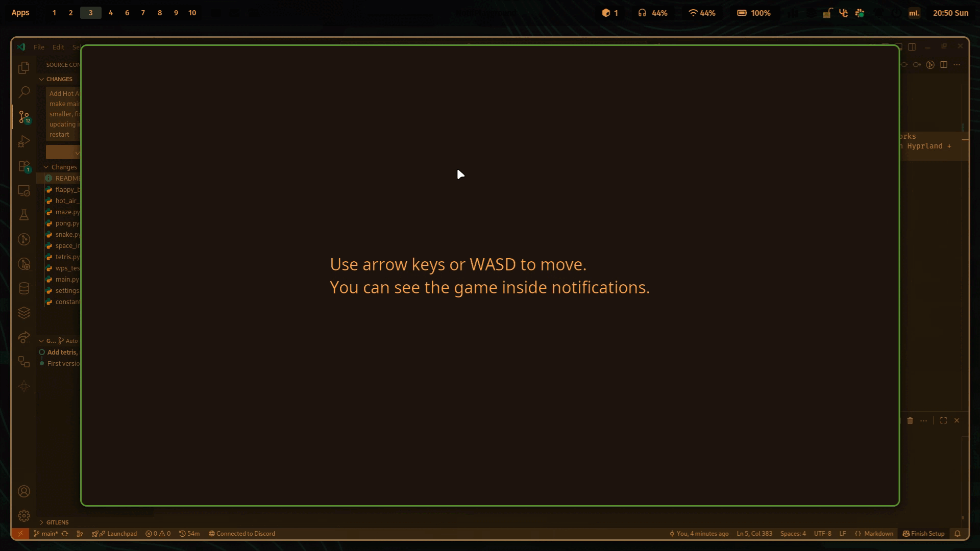 Add demo GIF, Hot Air Baloon, add a way to customize notification timeout, rows and columns, make main menu buttons smaller, fix tetris not updating info label after restart